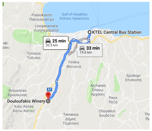 Παρακαλούμε επικοινωνήστε απευθείας με το Κ.Τ.Ε.Λ. Ηρακλείου-Λασιθίου στα παρακάτω τηλέφωνα ή ενημερωθείτε από την επίσημη ιστοσελίδα του για τα διαθέσιμα δρομολόγια, προτού προγραμματίσετε την επίσκεψή σας στο οινοποιείο μας.